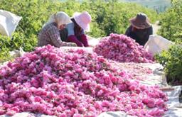 玫瑰的豐收季節(jié),大馬士革玫瑰競(jìng)相綻放,晨光微曦,暗香浮動(dòng)時(shí),花農(nóng)穿梭其中,把帶著露水的鮮花瓣輕輕摘下放入籃筐。