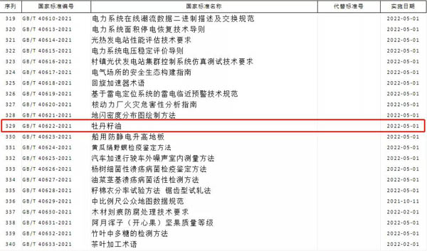 10月11日,2021年第12號(hào)中國(guó)國(guó)家標(biāo)準(zhǔn)公告發(fā)布,國(guó)家標(biāo)準(zhǔn)《牡丹籽油》將于2022年05月01日實(shí)施。