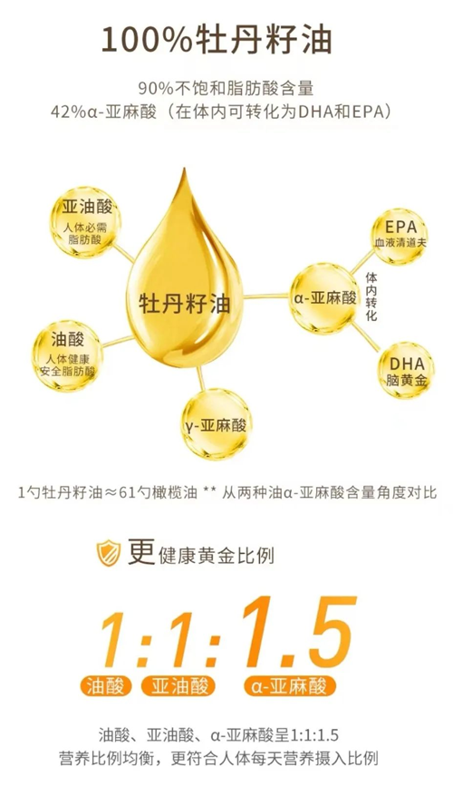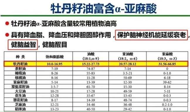 牡丹籽油的α-亞麻酸(屬Ω-3系列)是人體必須脂肪酸,是DHA(腦黃金)、EPA(血管清道夫)的母體,是(嬰幼兒、青少年)腦神經(jīng)、視神經(jīng)構(gòu)成和發(fā)育的主體成分,被世界衛(wèi)生組織(WHO)和聯(lián)合國糧食組織譽為“血液營養(yǎng)素,植物腦黃金”。