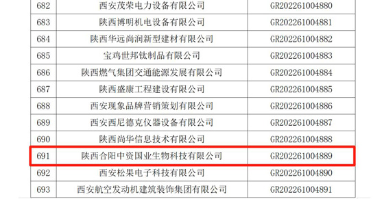 日前,省科技廳發(fā)布了陜西省2022年第四、五批高新技術(shù)企業(yè)名單,陜西合陽(yáng)中資國(guó)業(yè)生物科技有限公司成功入選。