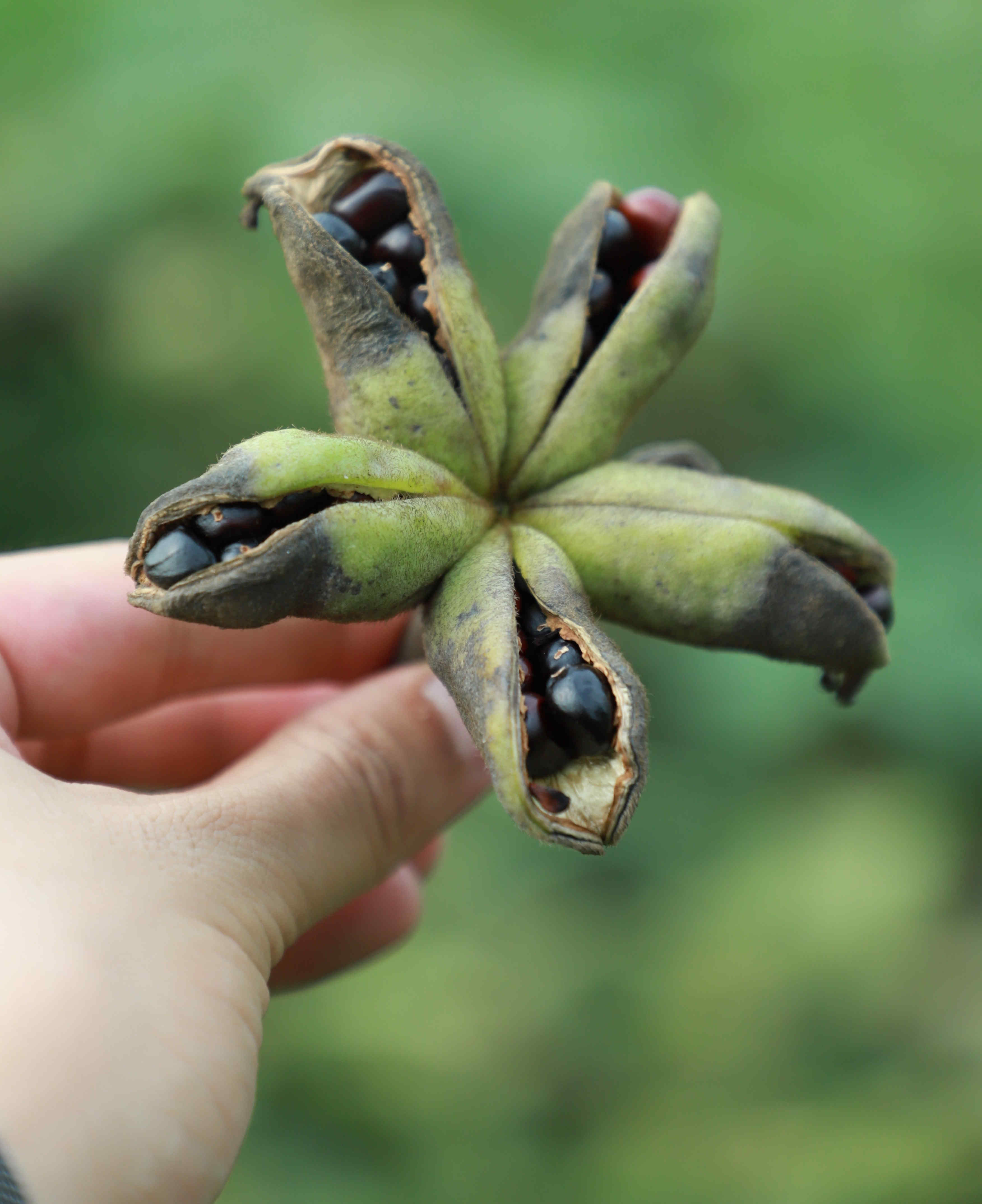 果莢熟透開裂,牡丹籽掉落,難以收成