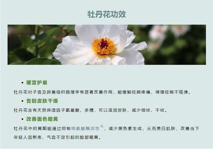 近代對牡丹花的研究更為深入和廣泛,發(fā)現(xiàn)了牡丹花對女性有諸多益處,其中開花初期的牡丹花效果更好。