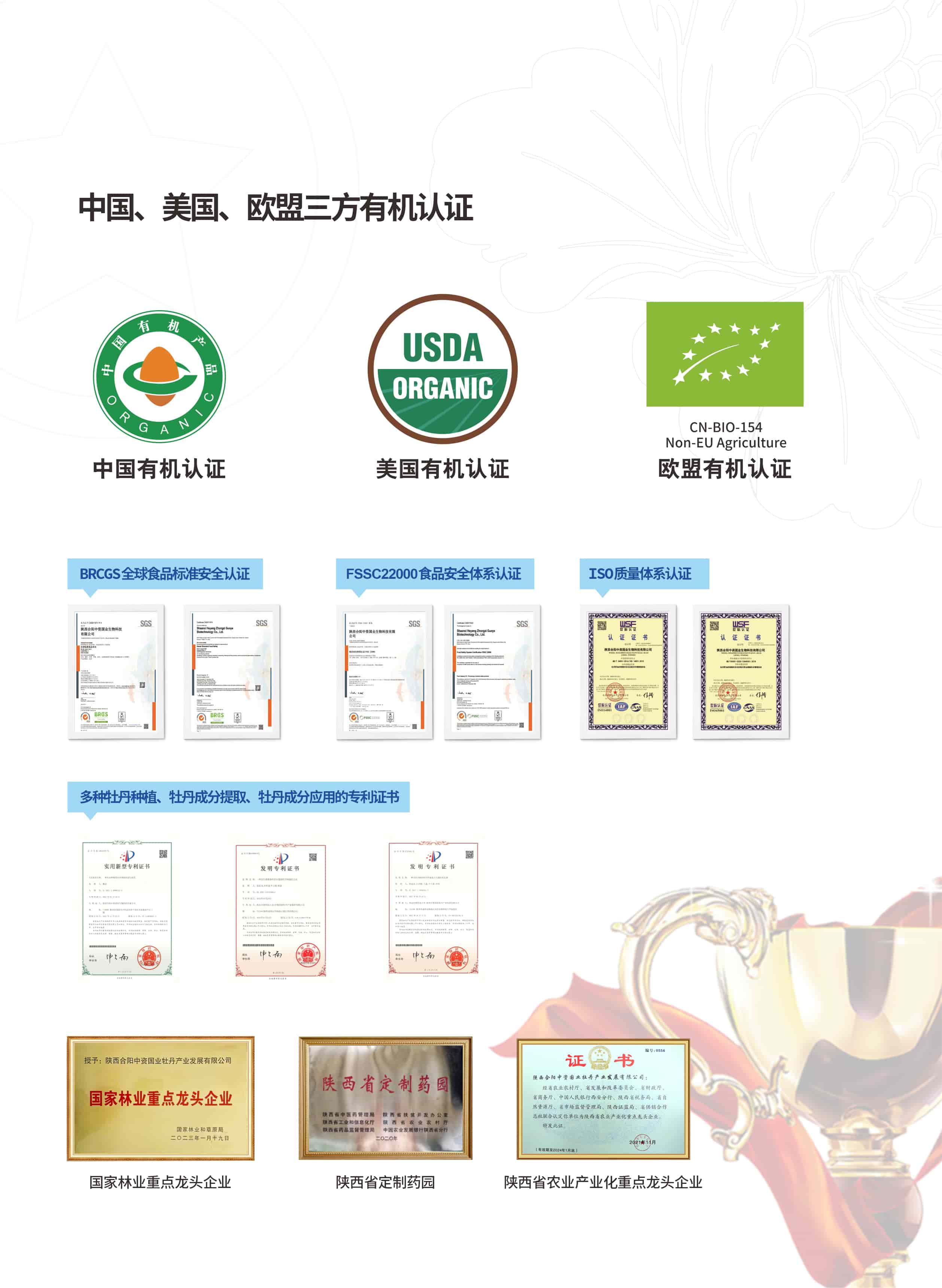 中資國(guó)業(yè)通過(guò)中國(guó)、美國(guó)、歐盟有機(jī)認(rèn)證,以及ISO、FSSC22000和BRCGS認(rèn)證,獲得多項(xiàng)專利,被評(píng)為陜西省定制藥園。