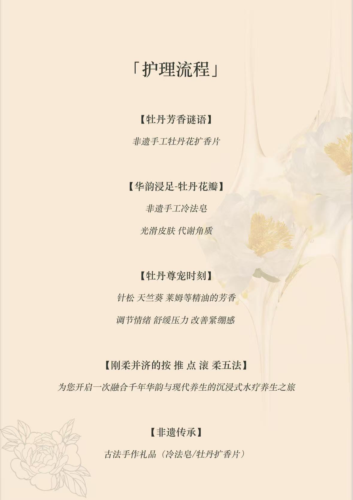 當特制牡丹花泡浴包融入溫?zé)岘側(cè),牡丹花瓣精華隨水波輕漾,全身心地沉浸在牡丹花的潤養(yǎng)氛圍中,周身氣血如沐春風(fēng),煥活新生。