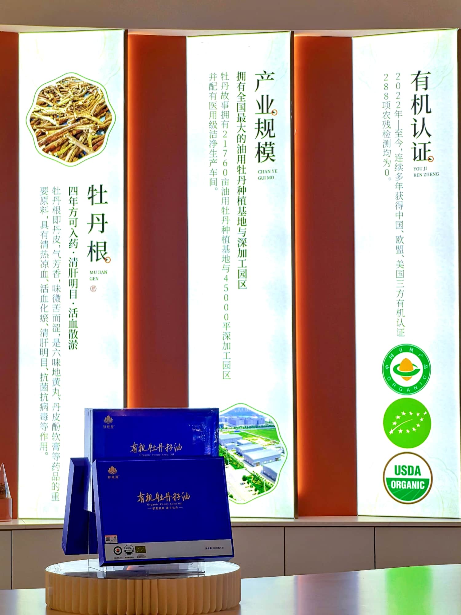 歷經多年科研攻關,2011年,以紫斑牡丹和鳳丹牡丹的籽仁為原料,經壓榨、脫色、脫臭等工藝制成的牡丹籽油被國家批準為新資源食品,填補我國高端木本油料缺口,成為守護國人健康的珍貴資源。